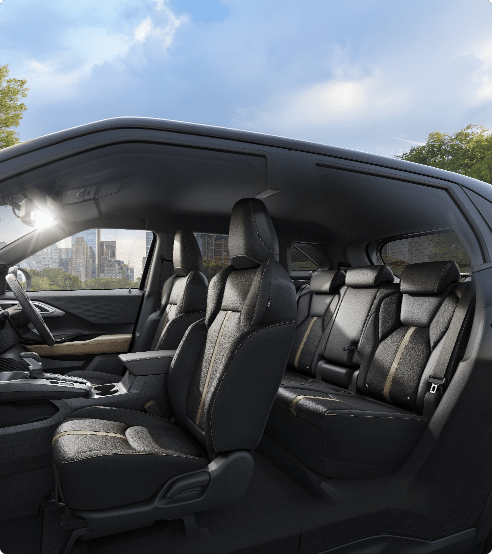 Luxurious synthetic leather seating with mocha stitching & accents.